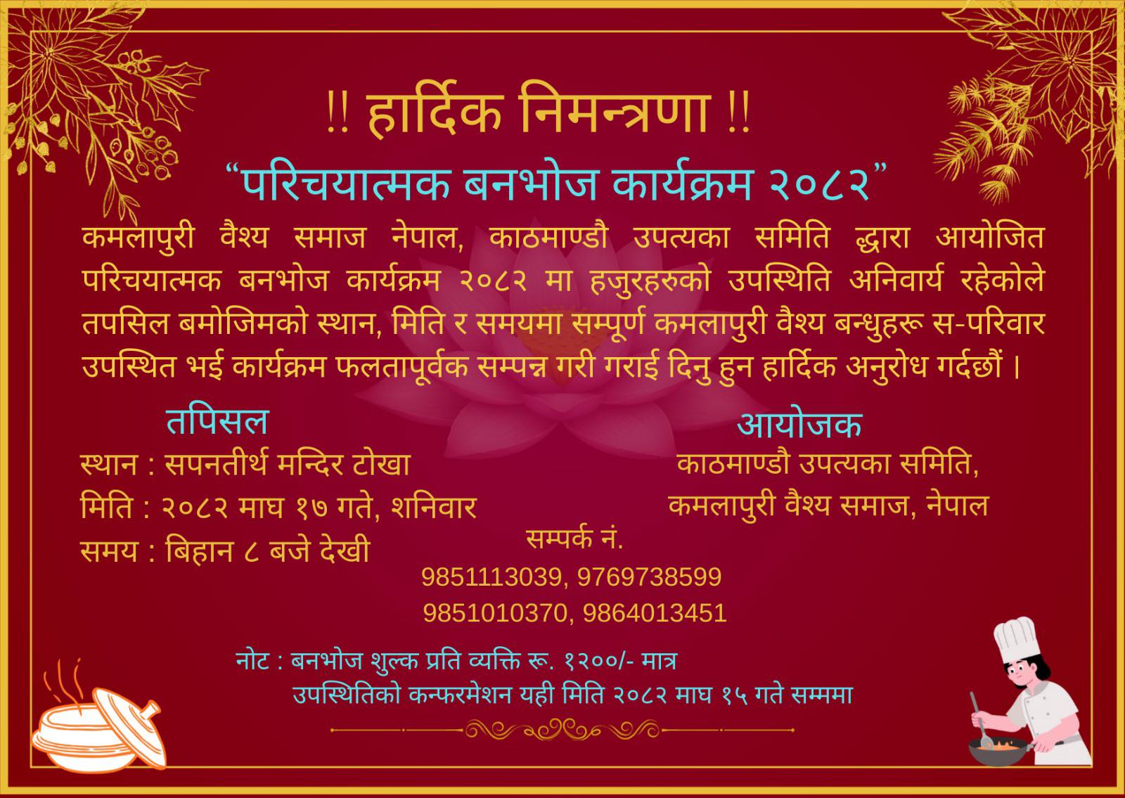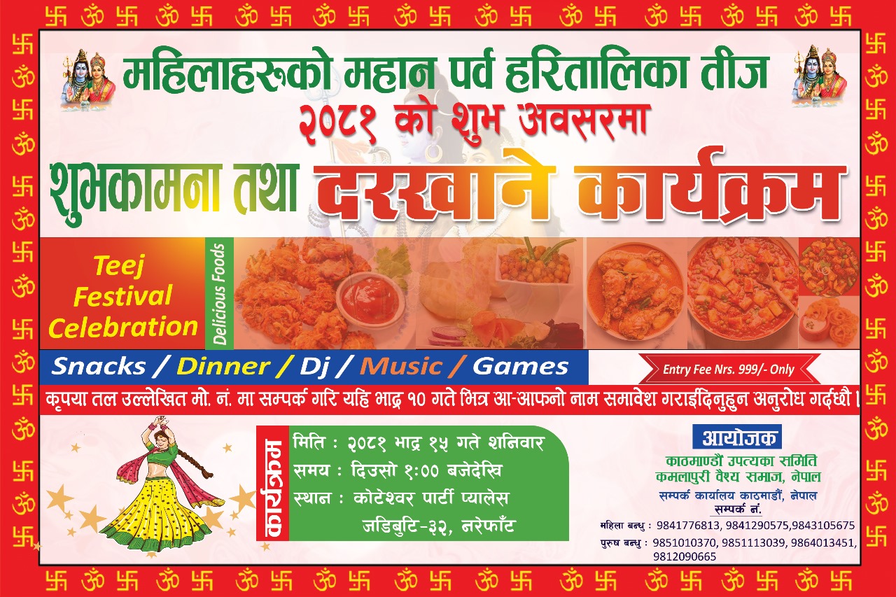 कमलापुरी वैश्य समाज, नेपाल, काठमाडौँ उपत्यका कार्य समित्ति द्वारा आयोजित महिलाहरुको महान पर्व हरितालिका तीजको शुभ अवसरमा भेट घाट तथा दरखाने कार्यक्रम मिति २०८१/०५/१५ गते स्थान : कोटेश्वर पार्टी पैलेस, जडिबुटी नरेफाटमा रहेको हुनाले सम्पूर्ण कमलापुरी बन्धुहरु आइ कार्यक्रमको शोभा बढाइदिनुहुन अनुरोध गर्दछौ।